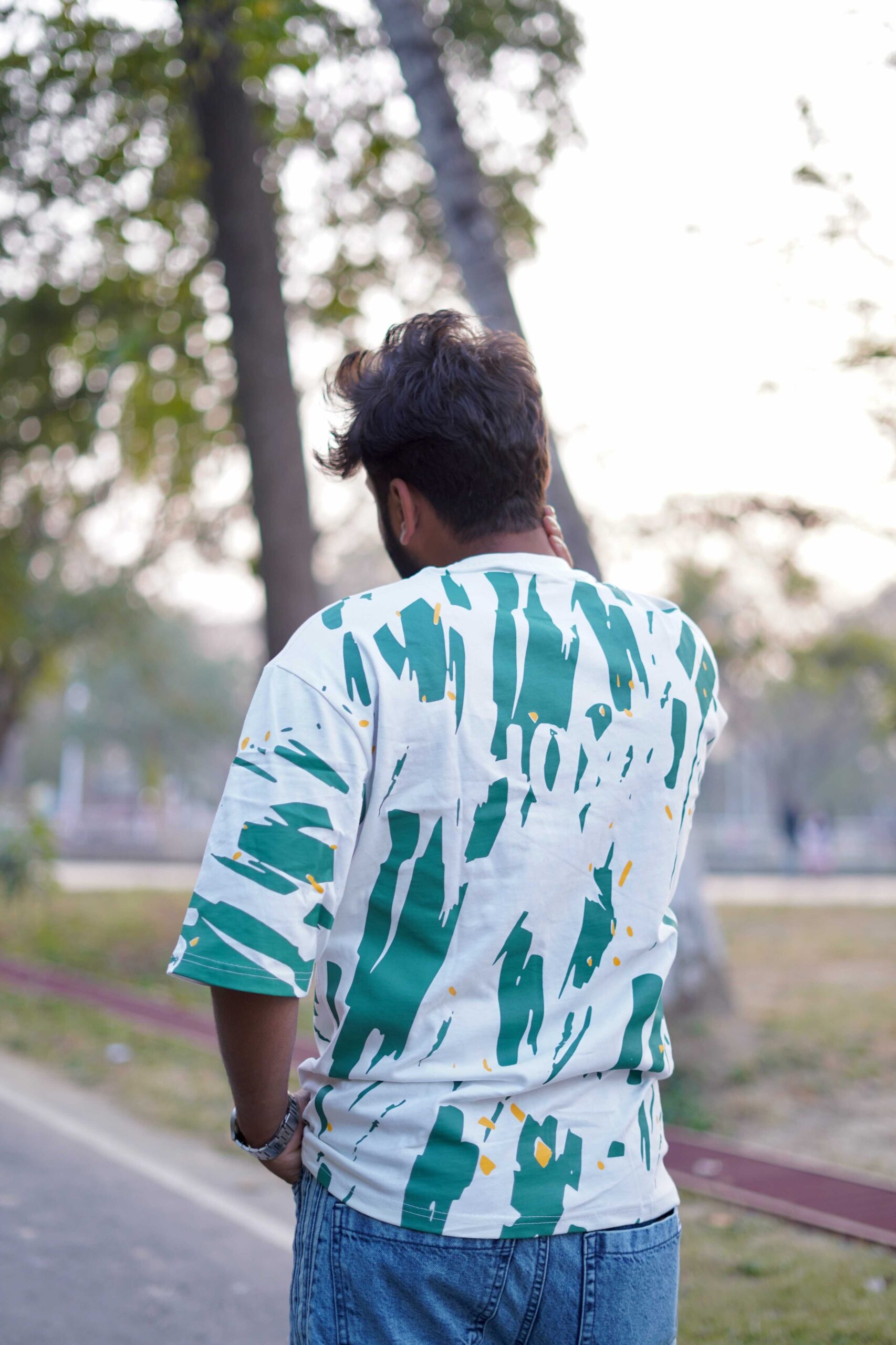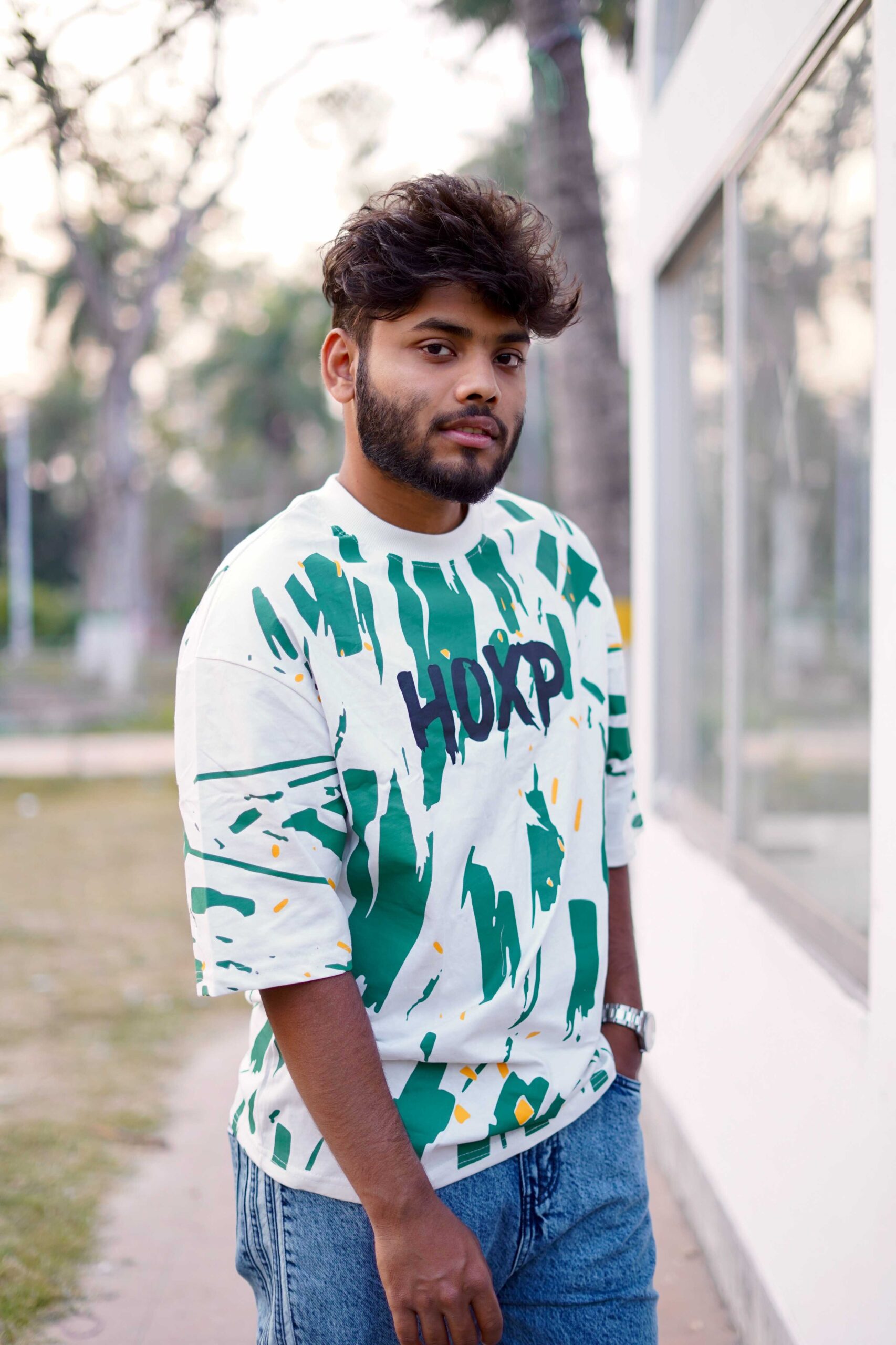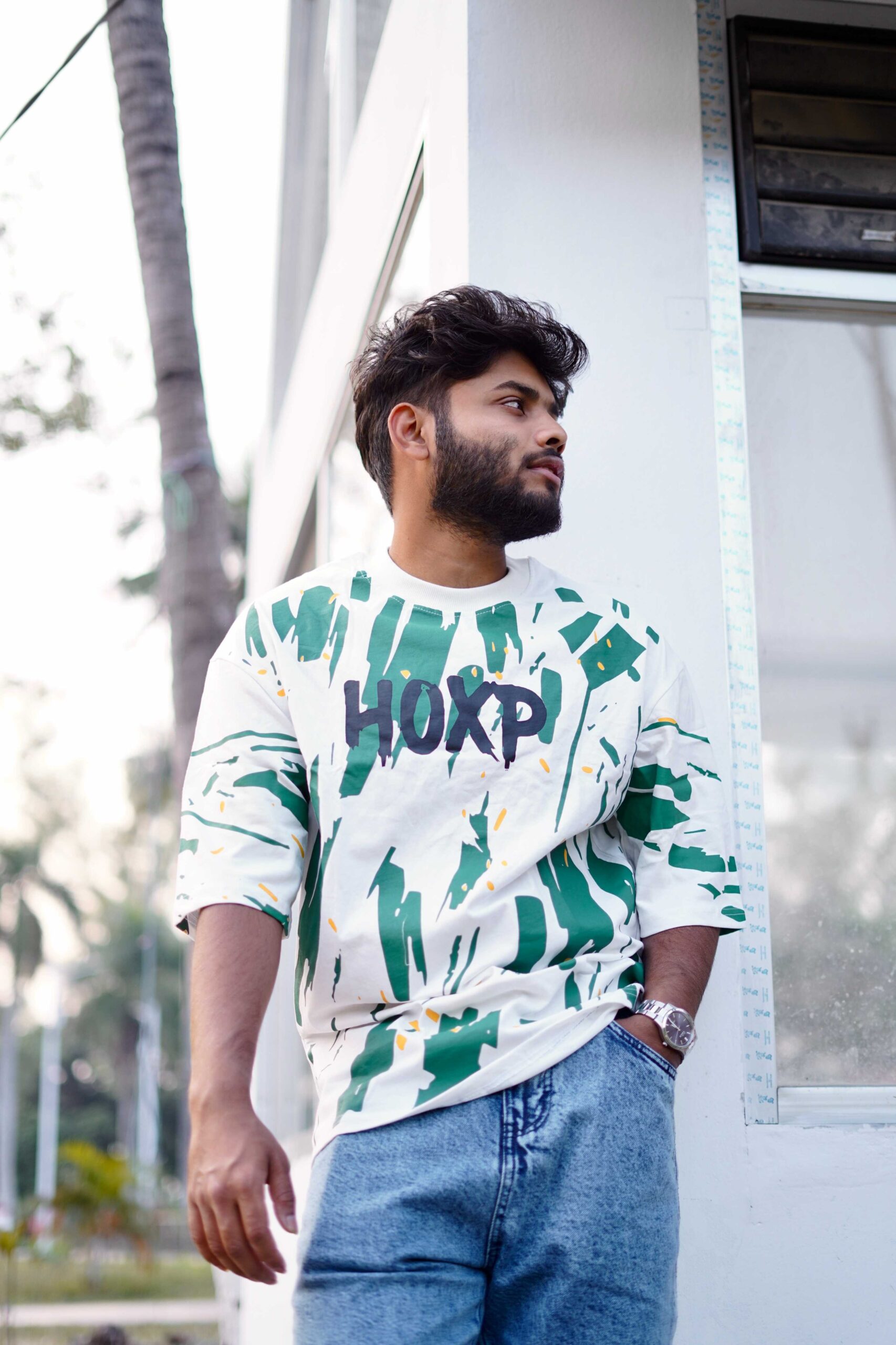 Versatile Design: Features a crisp white base with a dynamic abstract brushstroke pattern in forest green and yellow accents, finished with bold “HOXP” central branding.